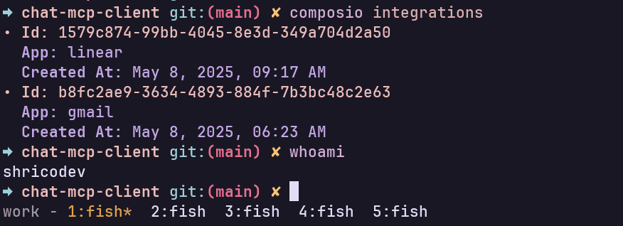 Once you add both the integrations, run composio integrations command, and you should see something like this: